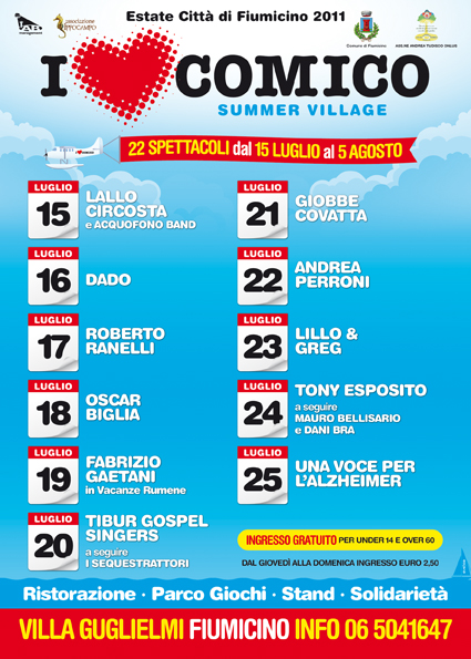 Si apre la stagione Estiva I LOVE COMICO 2011 che vede come protagonisti Lallo Circosta e Acquofono Band, Dado, Roberto Ranelli, Oscar Biglia, Fabrizio Gaetani, Tibur Gospel Singers, I Sequestrattori, Giobbe Covatta, Andrea Perroni, Lillo & Greg, Tony Esposito, Mauro Bellisario e Dani Bra, Una Voce per l'Alzheimer, Ondadurto Teatro, Antonello Costa, Rodolfo Laganà, Maurizio Battista, Pablo & Pedro, Miss Fiumicino 2011, Gianfranco Phino, Massimo Bagnato, Il Barbiere di Siviglia, Max Giusti, Gli Stadio.